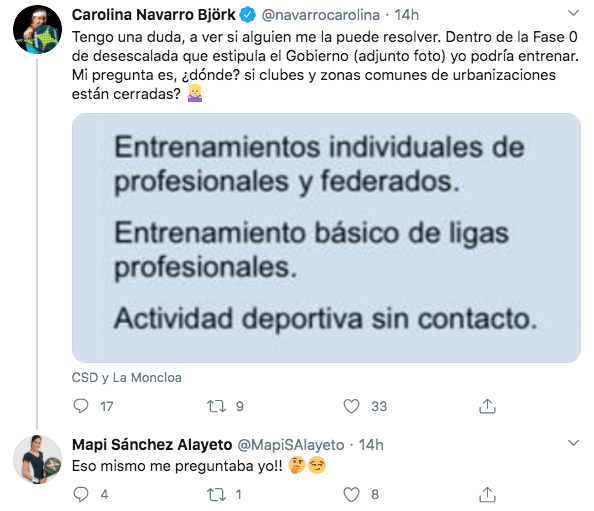 La duda principal la crea la disyuntiva de tener el permiso para entrenar pero no para hacerlo en el centro de entrenamiento. La jugadora del WPT Carolina Navarro (@navarrocarolina) en su cuenta de Twitter lanzó ayer una pregunta a todos sus seguidores: «Dentro de la fase 0 que estipula el Gobierno yo podría entrenar. Mi pregunta es, ¿dónde? si clubes y zonas comunes de urbanizaciones están cerradas.» A lo que Mapi Sánchez Alayeto (@MapiSAlayeto) replicó: «Eso mismo me preguntaba yo.»