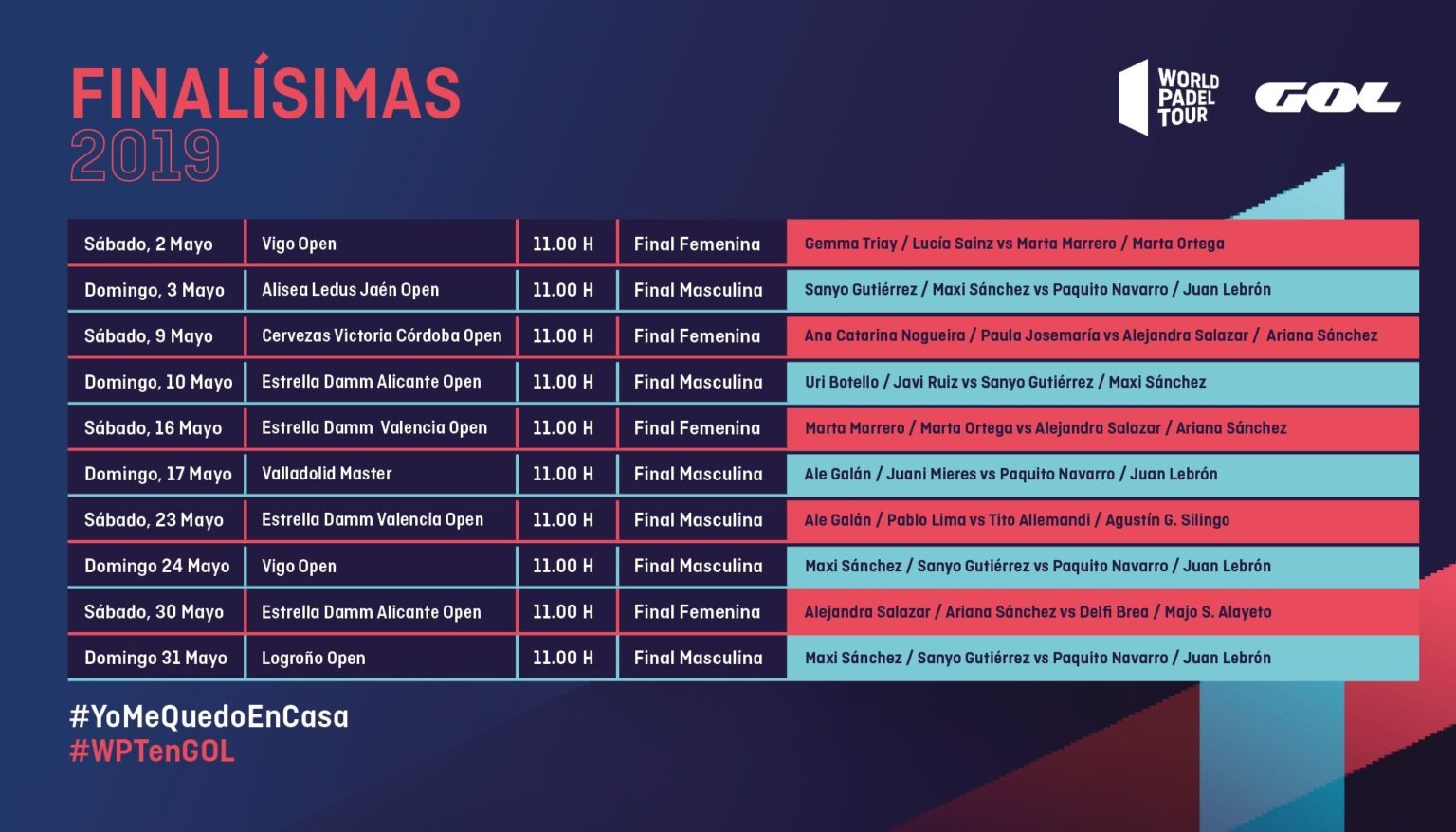 El calendario ha querido, además, que mayo tenga cinco fines de semana en 2020. Por ello, serán diez los partidos que ofrecerá Gol a los espectadores. Una decena de encuentros que corresponden a finales pasadas de torneos de World Padel Tour, tanto del cuadro masculino como del femenino. La selección de partidos permitirá ver de nuevo en acción a los mejores jugadores a nivel mundial y las ciudades donde se desarrolla el WPT. Desde Vigo a Córdoba, pasando por Valladolid, Alicante o Valencia. Y desde Paquito Navarro a Marta Marrero, pasando por Pablo Lima, Alejandra Salazar o Ale Galán. Sin duda, un plan televisivo que amenizará las mañanas de los fines de semana a miles de aficionados al mejor pádel del mundo.