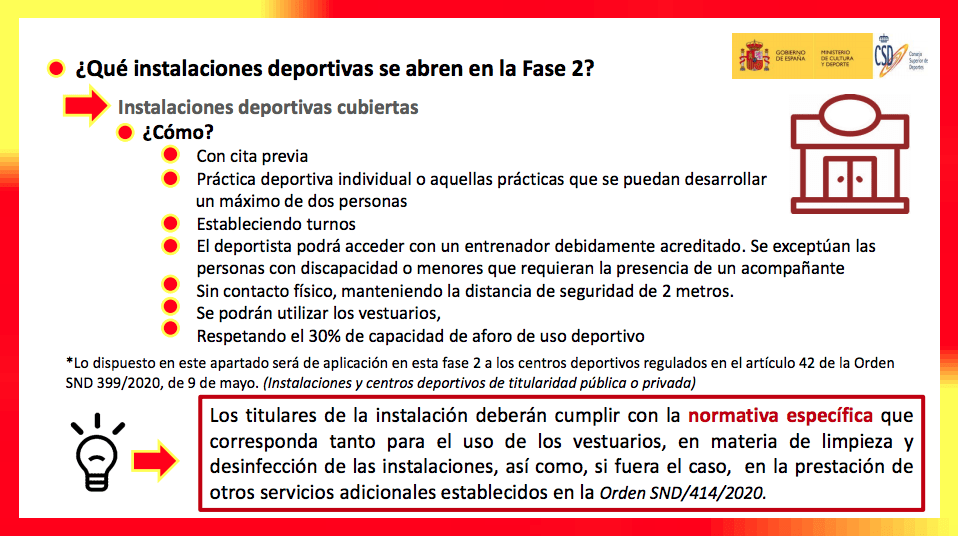 «¿Qué instalaciones deportivas abren en fase 2? Instalaciones deportivas cubiertas.» Son las instalaciones deportivas cubiertas o indoor las que procederán a su apertura en el momento que el territorio en el que se encuentra alcance dicha fase. Es decir, toda instalación deportiva que no sea considerada como tal no podrán abrir ni ofrecer servicios si se encuentran todavía en fase 1. (No es este el caso de las instalaciones al aire libre, que sí tienen la posibilidad desde la fase 1).