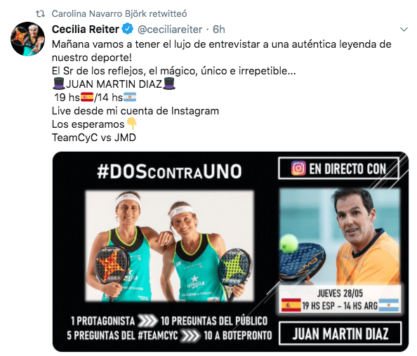 El argentino entrará en directo con a través de Instagram con las jugadoras del circuito femenino. Se enfrentará a las preguntas tanto a las preguntas de sus seguidores como a las preparadas por el «Team CyC». Después de haber tenido como invitados a máximas figuras del WPT como Paquito Navarro, Martita Ortega o Seba Nerone, llega el de Mar de Plata para brindarnos una divertida e interesante entrevista a los amantes del pádel.