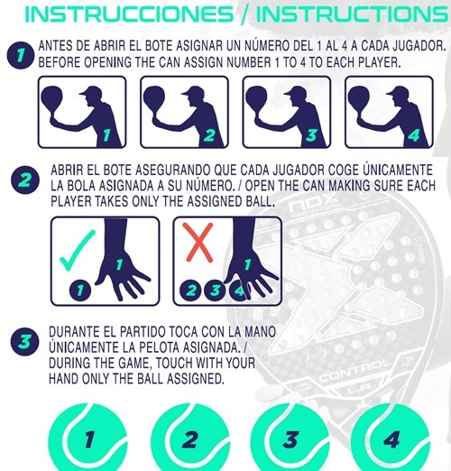 Este original sistema se ha bautizado como PlaySafe. Adapta su bote de cuatro bolas, único en el mercado, asignando cada de las pelotas a un jugador. La manera de utilizarlo es muy sencilla. Antes de empezar cada partido los jugadores se asignarán un número del 1 al 4. Al abrir las bote de bolas Nox Pro Titanium PlaySafe se cogerá la pelota con el número elegido. De esta manera, durante el partido hay que evitar agarrar con la mano el resto de bolas no asignadas, pasándolas con el pie o con la pala.