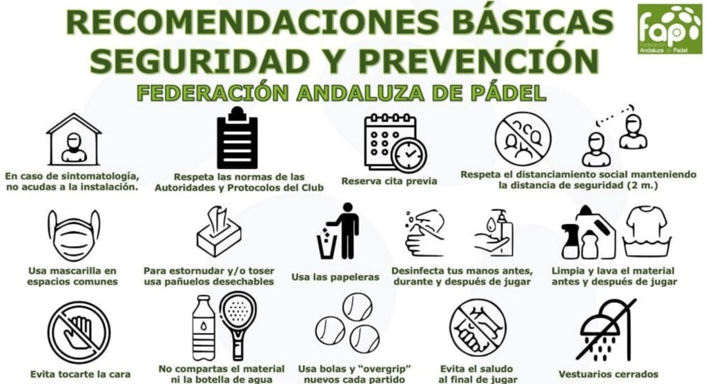Recordamos que durante esta fase las opciones de poder practicar pádel se limitan a clases individuales o juego de uno contra uno. La Federación Andaluza de Pádel ha publicado una serie de recomendaciones básicas para prevenir el contagio.