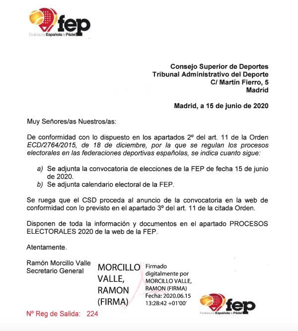 La Federación Española de Pádel hace oficial la convocatoria de elecciones en 2020. La entidad hasta ahora presidida por Alfredo Garbisu ha hecho público, en un comunicado en su web, el inicio del proceso electoral este 15 de junio. El 24 de julio será el día en que se celebren las elecciones a la Asamblea General. El 4 de septiembre será el día en el que salga elegido, en la reunión de la Asamblea, el Presidente y los miembros de la Comisión Delegada.