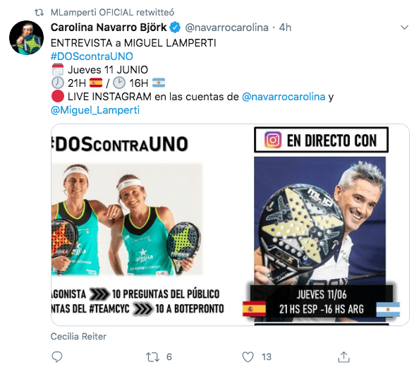 La cita tendrá lugar este jueves, 11 de junio, a las 21:00 horas (16:00 horas en Argentina). Se podrá seguir a través de las cuentas de Instagram de Carolina Navarro (@navarrocarolina) y Miguel Lamperti (@Miguel_Lamperti).