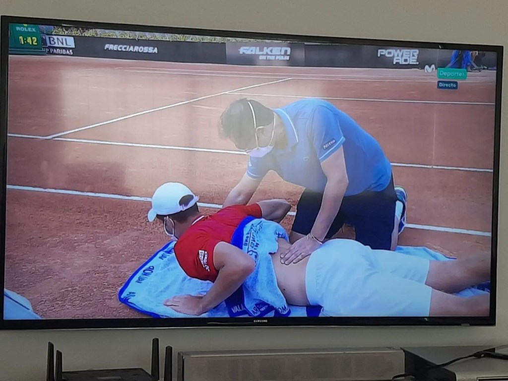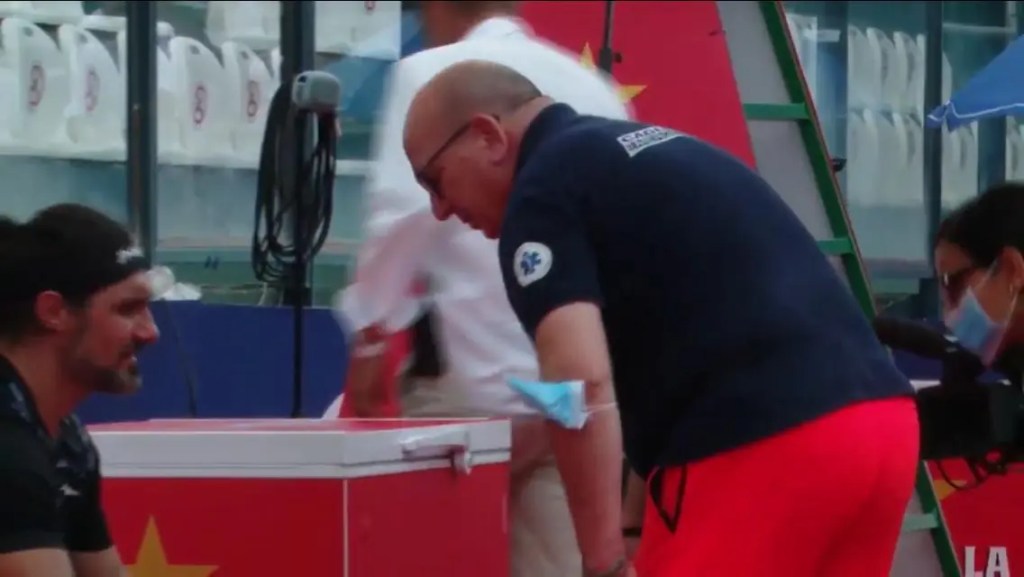 En la primera foto os mostramos a un tenista profesional atendido por un médico profesional del Masters 1000 de Roma, Italia. Resultado: higiene y mascarilla en su debido sitio.