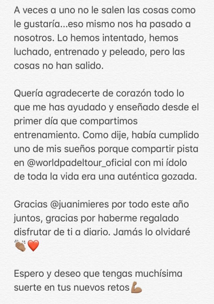 Así se despedía el jugador de pádel, Javier Garrido, de su compañero Juan Mières con el que ha compartido grandes momentos dentro de las pistas. Con un texto de agradecimiento en Twitter, Javi Garrido anunciaba su separación del que ha sido su compañero esta temporada WPT.