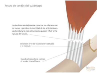 Recordar que los tendones se sitúan en los extremos de los músculos, y se adhieren al hueso (la rótula en el caso del cuádriceps). La rotura del tendón cuadricipital produce un gran déficit funcional, siendo el paciente incapaz de flexional ni extender la rodilla por el dolor.