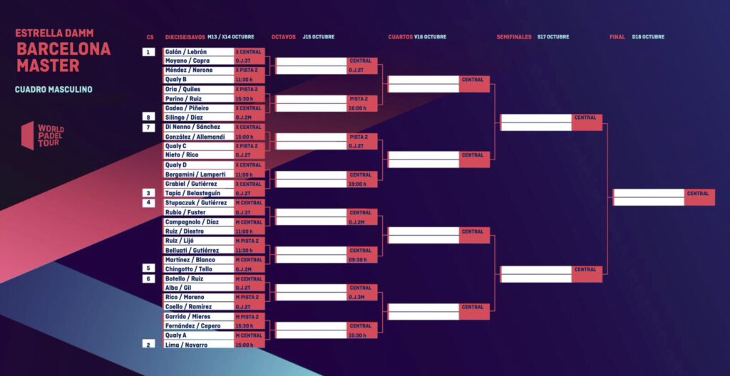 Las primeras rondas para clasificarse en el Estrella Damm Barcelona Master 2020 se realizarán en el Barberá Padel Indoor, desde el sábado 10 de octubre. Esto acabará con la selección de los cuadro binomios que accederán al cuadro final. WPT nos trae el cuadro oficial de este torneo.