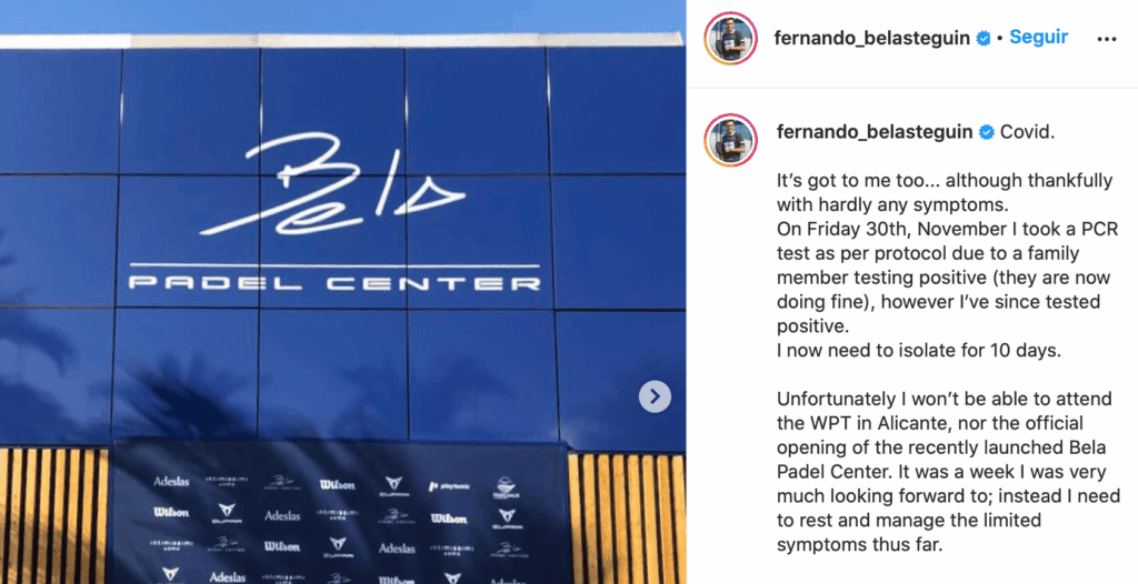 Así lo ha anunciado el jugador de pádel profesional en su cuenta de Instagram. El argentino, Fernando Belasteguín no podrá disputar el torneo alicantino debido a su positivo en coronavirus.