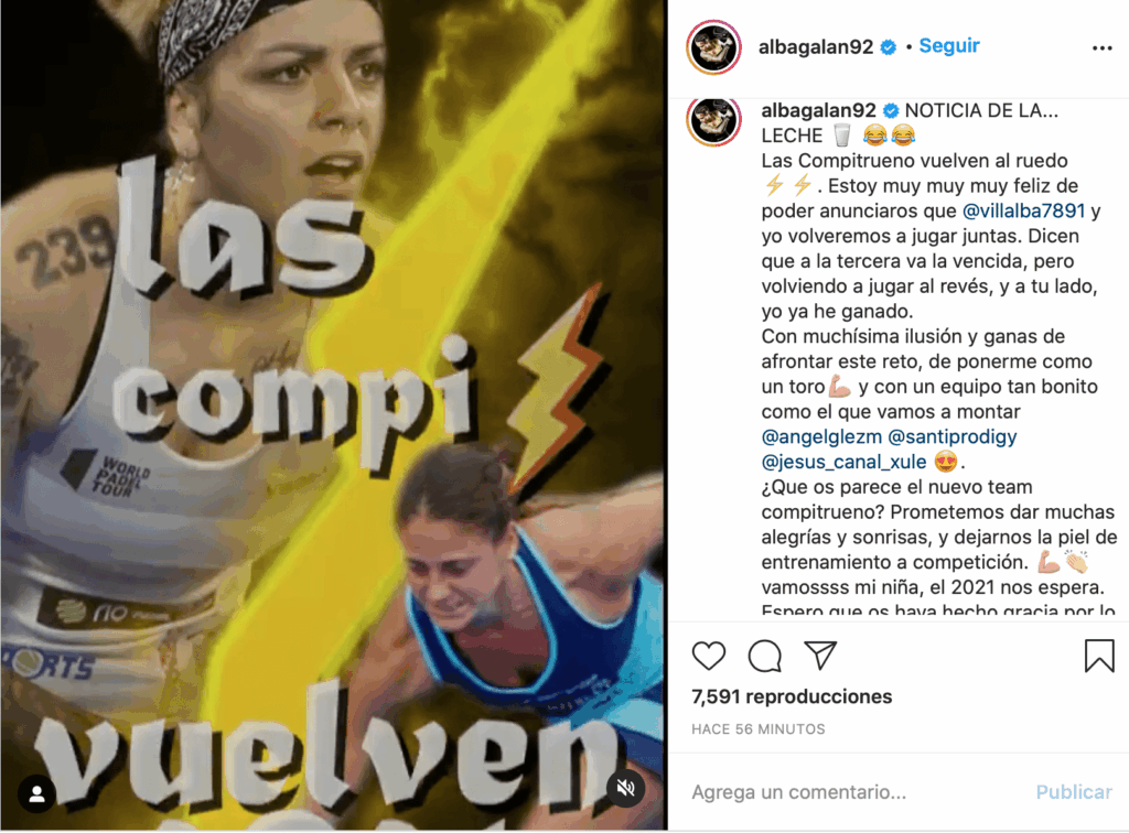 La jugadora de pádel, también ha anunciado en su comunicado oficial a través de sus redes, que vuelve a jugar de revés y anuncia que se encuentra con «muchísima ilusión y ganas de afrontar» los nuevos retos de la próxima temporada 2021, compartiendo pista con su compañera Mari Carmen Villalba.