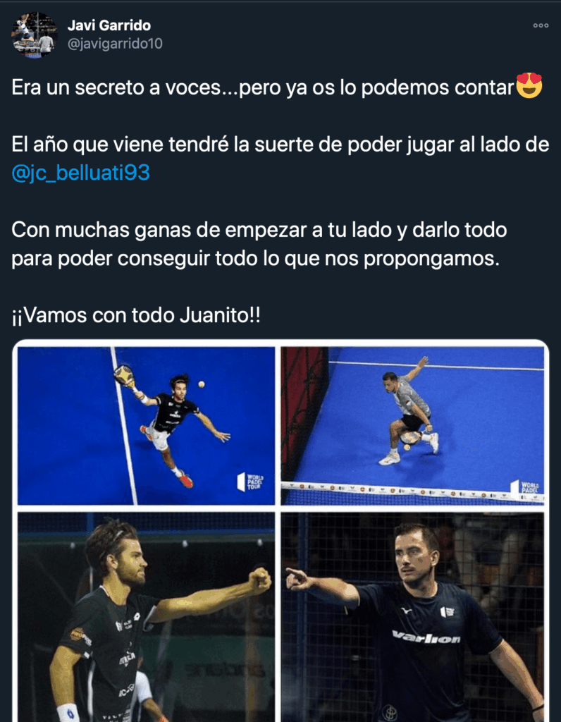 El jugador de pádel cordobés, Javi Garrido anuncia su unión con Juan Cruz Belluati para la temporada 2021.