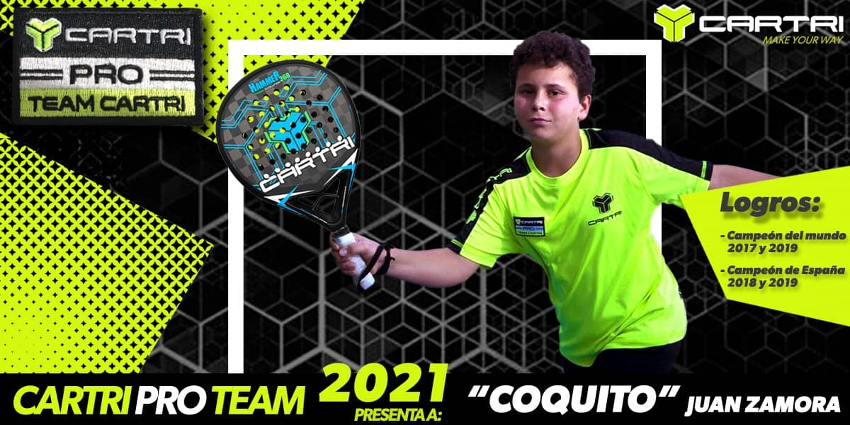 Es uno de los grandes estandartes del equipazo de Menores del Team Cartri. Dos veces Campeón del Mundo y con un futuro más que prometedor por delante, hablar de Juan Zamora (más conocido como Coquito) es hacerlo de uno de esos chicos tocados por una varita mágica, que le concedió el don de destacar en cualquier deporte que hubiese elegido… ¡¡Con la fortuna para todos nosotros de que decidió empuñar una pala de pádel!!