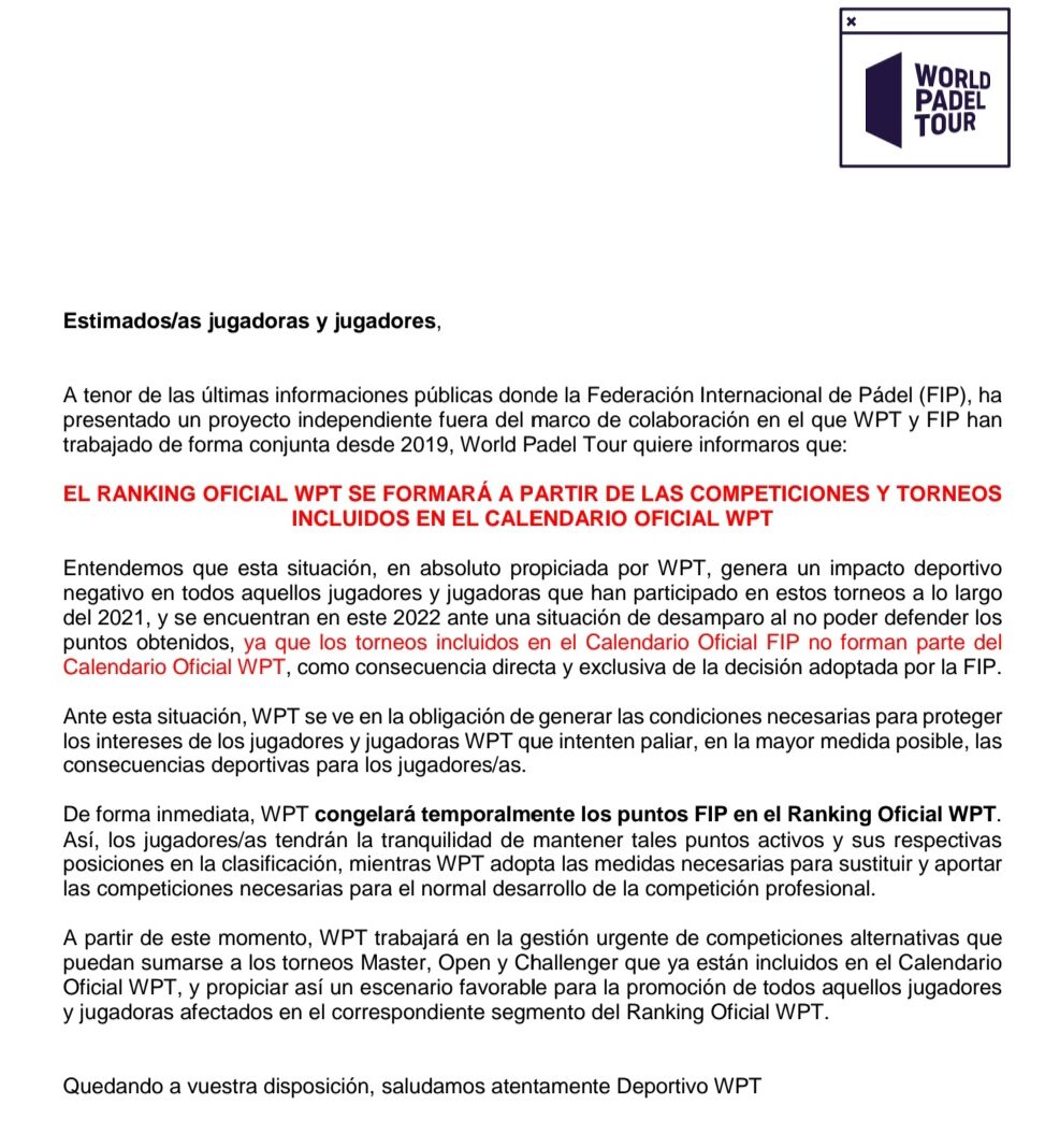 Este es el comunicado de WPT vía Contra_pared y StudioPadel: