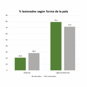 - La forma de la pala SÍ parece afectar. Hay muchos más jugadores que usan palas híbridas, en forma de lágrima y diamante, que los que usan palas redondas. Así, existen más jugadores que no se lesionan con palas redondas y un mayor % de lesionados con palas de otra forma.
