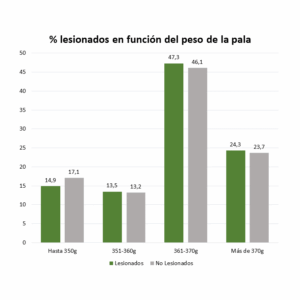 - Por último, lo que más parece afectar a las lesiones es el volumen de juego semanal, que aunque no es una características de la pala, sí que podría ser un factor importante relacionado con el manejo de la misma.