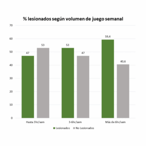 Parece que el mayor % de lesionados juegan más de 6 horas a la semana, por lo que, a mayor volumen de juego, más lesiones.