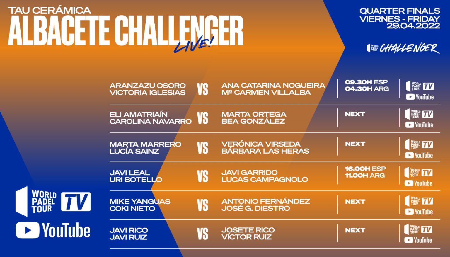 Javi Leal y Uri Botello que ayer hicieron una épica remontada contra Lamperti y Jon Sanz, tendrán enfrente a Lucas Campagnolo y Javi Garrido. Este partidazo lo podrás disfrutar a partir de las 16:00 en España. Posterior a este partido disfrutaremos del Yanguas/Jorge Nieto – Antonio Fernández/José García Diestro. Finalmente, en el tercer turno de la tarde veremos a la nueva pareja formada por Javi Rico y Javi Ruiz que se disputarán un puesto en semifinales frente a Víctor Ruiz y José Rico. Aquí tienes todos los partidos de los que podrás disfrutar hoy: