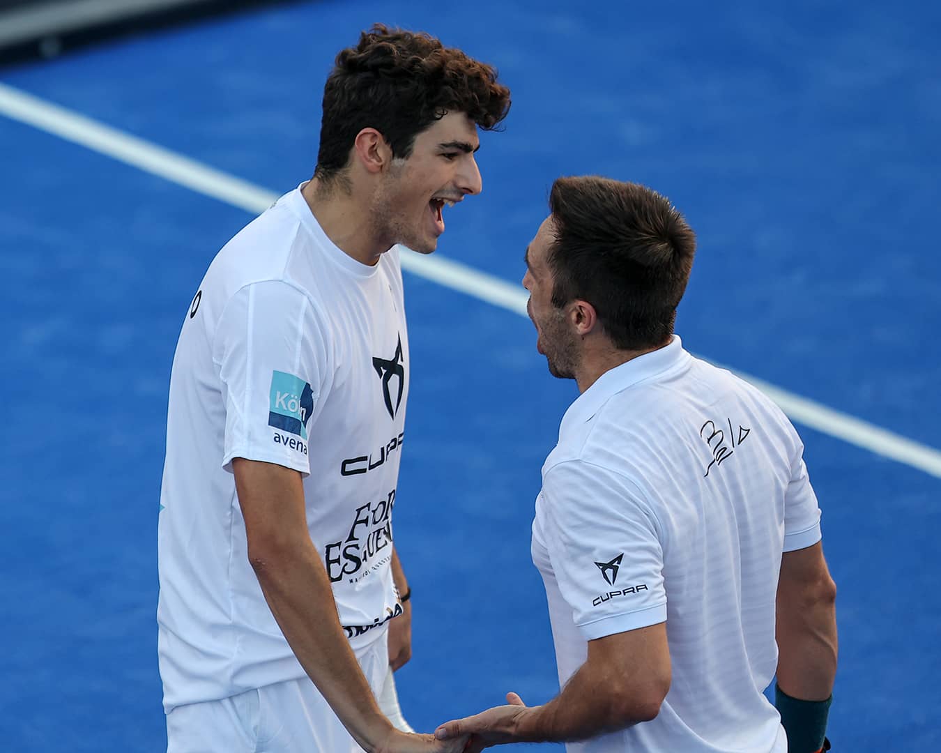 Velocidad, electricidad y una pegada demoledora eran las señas de identidad, nuevamente, para unos Lebrón y Galán que cerrarían el partido por 6-3/6-2. Primer billete conseguido. Llegaban la pareja de moda en los últimos torneos como son Fernando Belasteguín y Arturo Coello frente a la etapa 2.0 de los «Mykes». Lamperti y Yanguas tendrían la difícil tarea de tratar de frenar a la pareja 4 del torneo que está, seguramente, en su mejor mejor momento de la temporada. Imponente. Excesivo. Dominador. Sin piedad. Nos quedamos sin adjetivos para definir el 6-0 con el que «The Boss» y Coello presentaban su carta de bienvenida en esta jornada de Cuartos. Con otras sensaciones se encararía una segunda manga en la que los Mykes sí que iban a plantar más cara y mostrarse más rocosos, pero iba a ser insuficiente para alargar el partido hasta la tercera. El break del undécimo juego sería clave. En dos sets 6-0/7-5, Belasteguín y Coello conseguían el segundo billete a semifinales del día. Sigue a AnalistasPadel y no te pierdas ninguna novedad del NewGizaPremierPadel