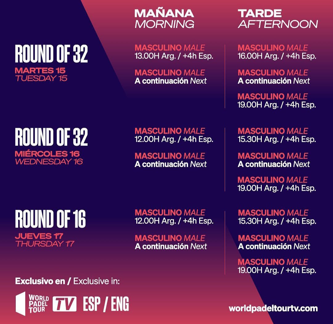 Entre hoy mañana tendrán lugar los enfrentamientos de la ronda de 32 parejas del emblemático torneo de la capital argentina La Rural volverá a acoger una de las fechas más señaladas por jugadores y aficionados en el calendario World Padel Tour. Hoy, martes 15 de noviembre comienzan los dieciseisavos del MAster Buenos Aires  a las 17 hora española y 13 hora local, y hay varios cruces que ningún aficionado a este deporte querría perderse. La jornada se abre con dos partidos emocionantes, en los que se enfrentarán Ramiro Moyano y Xisco Gil frente a Momo González y Álex Ruíz, y Maxi Sánchez y Lucho Capra frente Javi Leal y Javi Rico. Paquito Navarro, que se presenta a este torneo con Mike Yanguas, antes de hacer definitiva su unión con el gato Tello, debuta a las 20 hora española y 16 hora local frente a Iván Ramírez e Iván Martos. Y su expareja, Martín Di Nenno disputará otro de los partidos del día, junto a Coki Nieto, frente a una dupla que vuelve a unir sus caminos momentáneamente tras la polémica que despertó su separación, Javi Garrido y Lucas Campagnolo. Mañana miércoles 16 habrá también varios encuentros en los que fijarse detenidamente. A las 16 hora española y 12 hora local, debuta el Boss, Fernando Belasteguín, junto a Arturo Coello, que se verán las caras con Denis Perino y Sergio Alba. Al finalizar este enfrentamiento iniciarán su andadura en Buenos Aires los número dos del mundo, Sanyo y Tapia, contra Rafa Méndez y Álvaro Cepero, y a las 19:30 hora española y 15:30 local aparecerán en escena los número uno, Lebrón y Galán, que tendrán en frente a Víctor Ruíz y Lucas Bergamini.