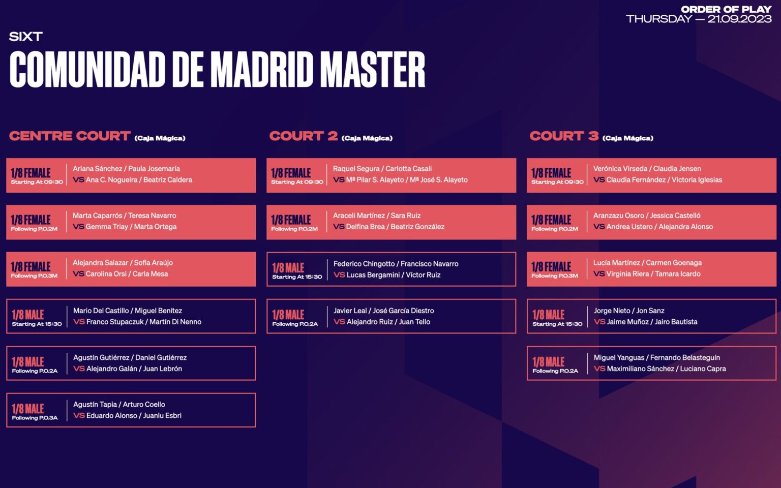 El siguiente turno de partidos daba comienzo con Delfi y Bea que ganaron 7-5/6-3 a Araceli Martínez y Sara Ruiz no sin haber sufrido un poco en el primer set. Aun con eso, consiguieron dominar el segundo set y sacar el partido cómodas en la pista 2. Por otro lado, en la pista 3, se volvía a ver a unas Alejandra Alonso y Andrea Ustero imperiales en la verdadera Caja Mágica. Esta vez, se cargaron a unas cabezas de serie como lo son Aranzau Osoro y Jessica Castelló en tres sets 2-6/6-4/5-7. La verdadera pena es que no pudimos disfrutar de este partido en la central. No obstante, la pista central también nos iba a llenar de emoción con un partido entre Gemma y Marta Ortega contra Marta Caparrós y Teresa Navarro. El partido caía del lado de las nº2 no sin sufrir lo suficiente. Marta y Teresa tiraron de garra, y aunque perdieron 1-6/6-1/0-6. https://twitter.com/WorldPadelTour/status/1704805820955828243