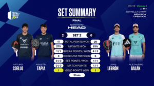Arturo y Agustín, al comenzar el segundo set, quisieron cambiar como se estaba desarrollando el partido. Eso no fue porque no pudieran, sino porque Galán y Lebrón no les dejaron. Un 4-0 de inicio con dos breaks hicieron que los nº3 fueran mucho más tranquilos. Su pádel era de otro planeta porque nadie podía pararles. Esto decantó ya el resultado que finalmente sería para Juan y Ale. Arturo y Tapia aun así quisieron entrar al partido aunque fuera tarde queriendo reaccionar. Los 1 hacían dos juegos seguidos poniendo el 4-2 con un break. Eso sí, no fueron capaces de mantener el servicio que les metía de lleno en el partido y tras algunas definiciones perfectas de Galán, ponían el 5-2 con otro break. Con todo esto, Galán y Lebrón se ponían en la peor situación posible, cerrar un partido, que dicho por algunos jugadores, es el punto más difícil.