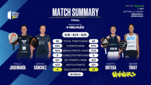La batalla por el título en el tercero iba a ser una batalla sin precedentes. Parecía un deja-vu. Esto ya lo habíamos vivido.  Todo comenzaba con los dos primeros servicios para cada pareja pero, en el tercer juego, las nº2 Marta y Gemma se colocaban break arriba con su posterior confirmación. Algo difícil de creer por como estaban jugando las número 1. Con todo lo sucedido y aprendido, se encarnizó una batalla con múltiples puntos de oro que hicieron que todo se pusiera a favor de las nº2 con el 5-3 en el marcador.  Después de remontar, todo iba a ser de infarto. Punto de oro que volvía a restar Gemma que, tras un juego antológico se acababan llevando las 1 celebrándolo porque estaban a un paso de perder el torneo. En el descanso, veíamos que en el partido se habían jugado 13 puntos de oro, 9 para Gemma y Marta, pero por el otro lado, 4 para Ari y Paula. La batalla estaba servida, porque si las 1 no quebraban estaban fuera. Este juego, de puro infarto, las nº1 estaban 30-40 arriba para quitarles el break, pero Paula falló una bola aparentemente fácil. Esto ponía el punto de oro quizás más tenso de todo el torneo. Unos ataques y defensas antológicas hacía que Martita metiera una bola a la que Ari no llegaba que hacía que ella y la jugadora local, Gemma Triay se coronaran como campeonas de Menorca batiendo a unas número 1 que no se rindieron. 6-4/4-6/6-4 coronaron a las nº2 en Menorca con unas estadísticas que suelen reflejar una victoria, los puntos de oro. 6 puntos de oro de diferencia fueron la clave para que se llevaran la victoria. Algo merecido, por lo que había estado luchando, pero que Paula y Ari no les habían permitido, ganar otro torneo y así fue.   Desde AnalistaPadel queremos felicitar a Gemma y Marta por su primer torneo como pareja en WPT A su vez dar su más sentido pésame y expresar sus condolencias a la jugadora Paula Jose María y a su familia por el fallecimiento de su abuela.   Así ha sido y así se lo hemos contado desde AnalistasPadel.