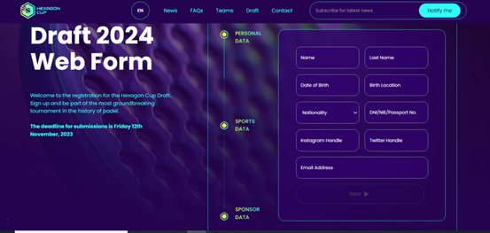 El proceso de inscripción es muy sencillo, ya que tan sólo hay que rellenar el formulario disponible en la página web del torneo (https://www.hexagoncup.com/draft). El plazo de inscripción finaliza el viernes 10 de noviembre de 2023. Los datos que tendrán que aportar los potenciales jugadores y jugadoras incluyen información personal (nombre, edad, nacionalidad, patrocinadores, etc.). También incluirán datos más técnicos como la posición en pista (drive o revés), mano/brazo con el que juegan (derecha o izquierda) y ranking en distintas clasificaciones. Esto último servirá como «insights» para los equipos a la hora de seleccionar a sus jugadores. Nacida bajo el lema “For the fans. For the Players. For the Game”, Hexagon Cup llega con la ambición de ofrecer un enfoque disruptivo, así como el firme propósito de transformar el deporte de la pala. Para ello, propone aunar en un formato completamente novedoso a las estrellas del pádel. Competirán en un entorno e instalaciones de primer nivel y que dará al público un papel fundamental en el desarrollo de la competición. Si no quieres perderte la oportunidad de poder participar de este proyecto con unas alas maravillosas, no dudes en tirar tu candidatura. Esto a algo que puede ser mundial y muy relevante no solo en el mundo del pádel, sino en el mundo deportivo en general.