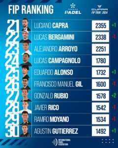 Llegamos a la parte más movida del ranking, el top 30 pasa a ser liderado por Luciano Capra que asciende una posición tras escalar al brasileño Lucas Bergamini. Otro que da paso adelante es el valenciano Eduardo Alonso, que junto a su compañero Alex Arroyo (23) vienen cosechando buenos resultados y metiéndose poco a poco en fases finales. La pareja hispano-argentina conformada por Xisco Gil y Ramiro Moyano no logran levantar cabeza, a través de malos resultados, han bajado un casillero por cada lado. Y por último, nos encontramos al más joven de la saga Gutiérrez, Agustín gana lugar y se cuela entre los 30 mejores del ranking masculino.   Únete a nuestra comunidad de Telegram haciendo click aquí, chat general, informaciones secretas y mucho más sobre el pádel.