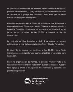 Tras conocerse estos sucesos la organización de Premier Padel ha emitido un comunicado en el que anuncia el cambio de horario para la jornada de semifinales de mañana sábado.