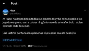Un exdirector de A1Padel afirma que se ha comunicado a los jugadores que no van a cobrar ningún torneo de este año. Solo habían cobrado el de Tucumán.