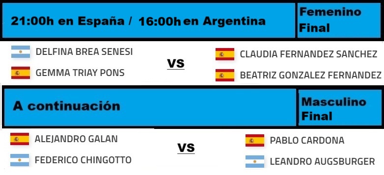 La final femenina comenzará a las 16:00h hora local (21:00h en España y 16:00h en Argentina), para dar paso a continuación a la final categoría masculina.Pista Central