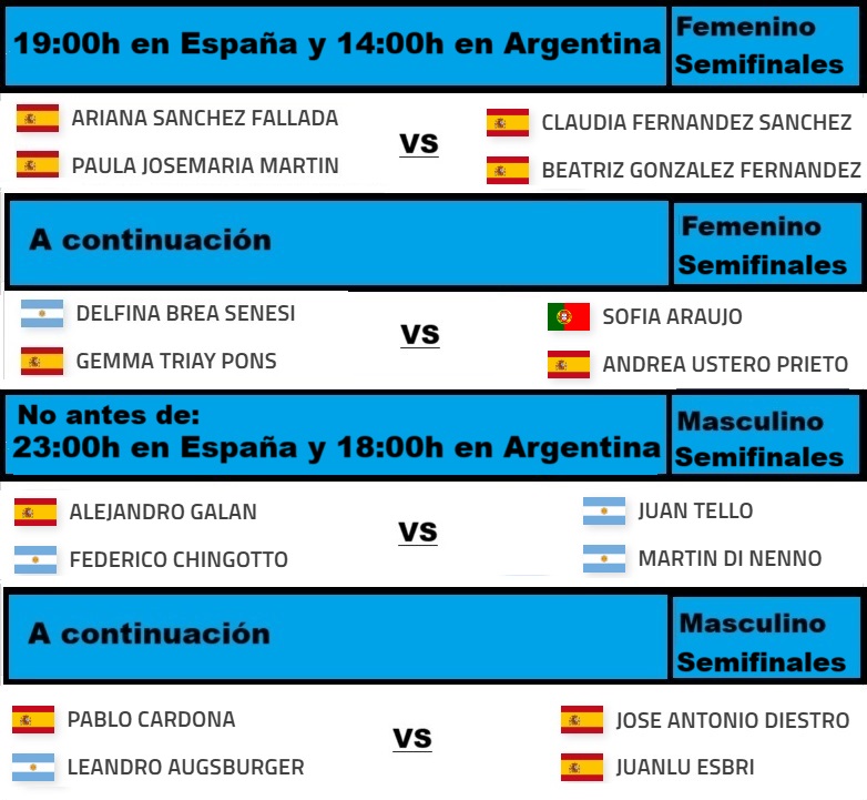 Los enfrentamientos de semifinales en el cuadro femenino comenzarán a las 14:00h local (19:00h ESP y 14:00h ARG). Las semifinales masculinas se disputarán a continuación, nunca antes de las 18:00h local (23:00h ESP y 18:00h ARG). Así quedaron los cruces.Pista Central