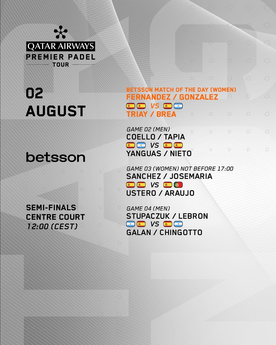 Hoy, sábado 2 de agosto, se disputan las semifinales del Tarragona Premier Padel P1. ¿Quieres saber los horarios, dónde puedes verlo y dónde apostar? Te lo contamos a continuación.