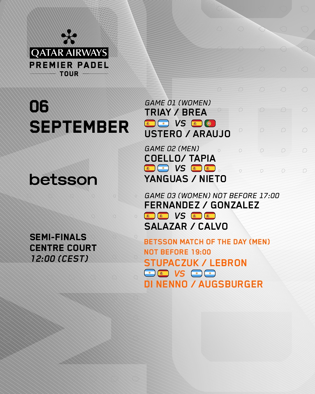 Hoy, sábado 6 de septiembre, se disputan las semifinales del Premier Padel Madrid P1. A continuación te contamos todo lo imprescindible para que no te pierdas nada de esta emocionante jornada, en la que el partido de la jornada será el que disputaran  Stupaczuk/Lebrón vs. Di Nenno/Augsburguer.