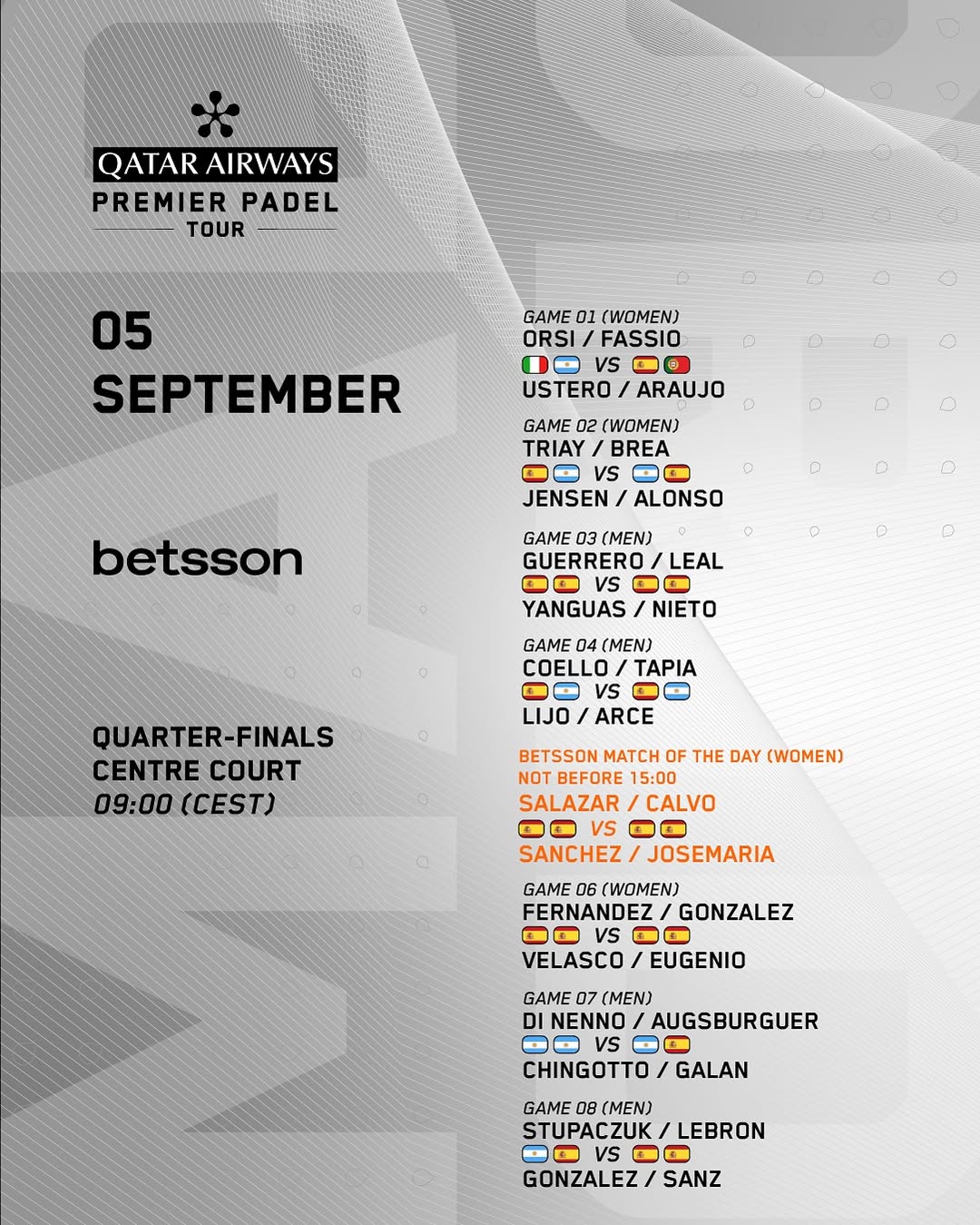Hoy, viernes 5 de septiembre, se disputan los cuartos de final del Madrid Premier Padel P1. ¿Quieres saber los horarios, dónde puedes verlo y dónde apostar? Te lo contamos a continuación.