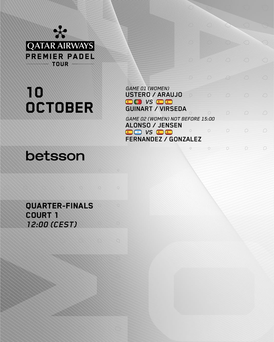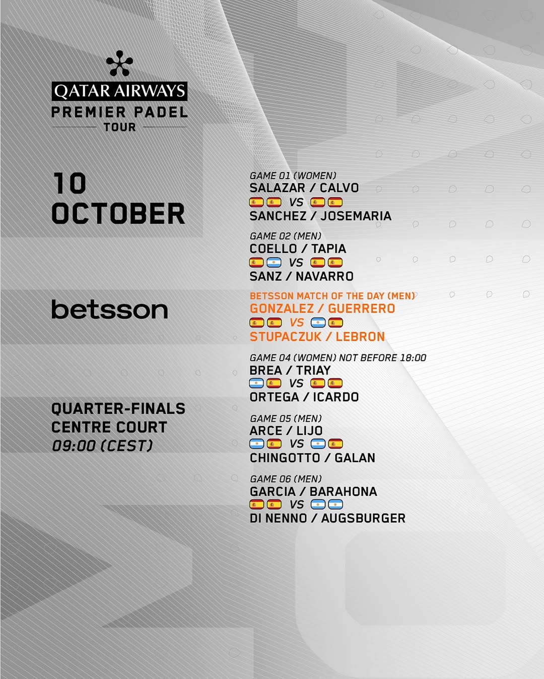 Los cuartos de final del Premier Padel Milano P1 están aquí y te traemos la guía definitiva para no perderte ni un segundo de la acción. El partido de la jornada será el que enfrentara a Momo/Guerrero vs. Stupaczuk/Lebrón.Todos los horarios y enfrentamientos