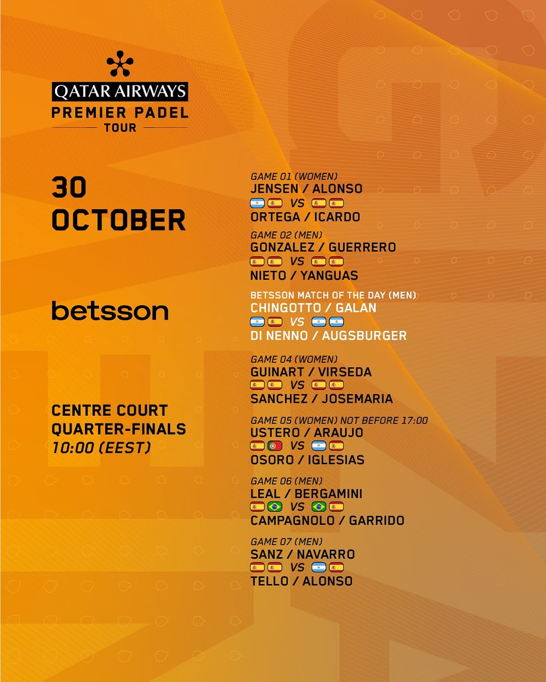 Cuartos de final del Premier Padel Newgiza P2, ¿Quieres saber los horarios, dónde puedes verlo y dónde apostar?, te lo contamos a continuación.