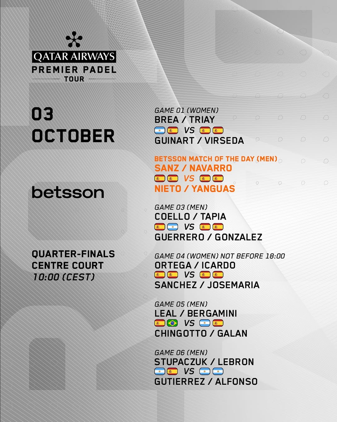 Comienzan los cuartos de final del Premier Padel Rotterdam P1. Te ofrecemos todos los detalles para que no te pierdas nada de esta emocionante jornada en la que podremos disfrutar del partido del día que enfrentara a Jon Sanz/Paquito Navarro vs. Coki Nieto/Mike Yanguas.Todos los horarios y enfrentamientos