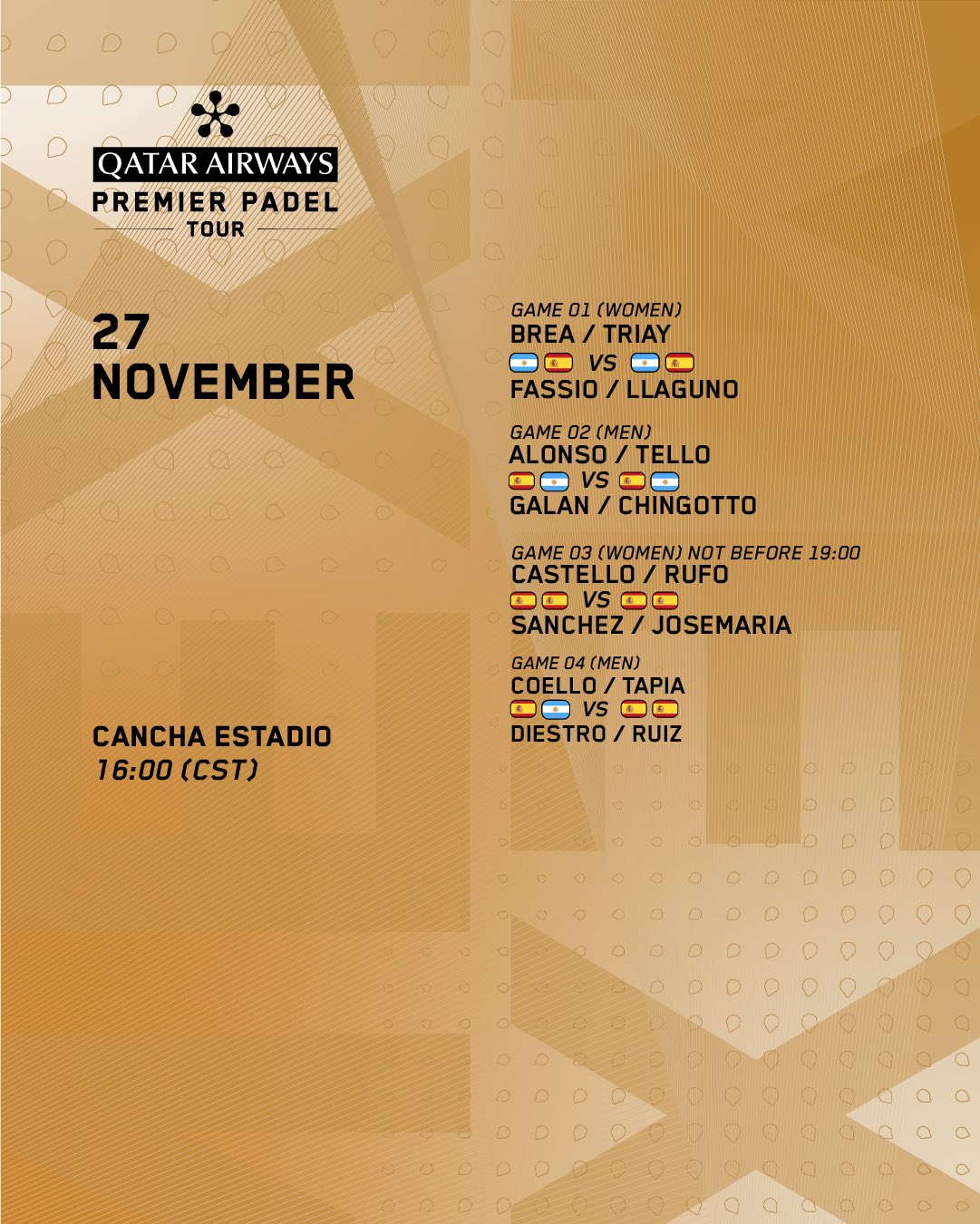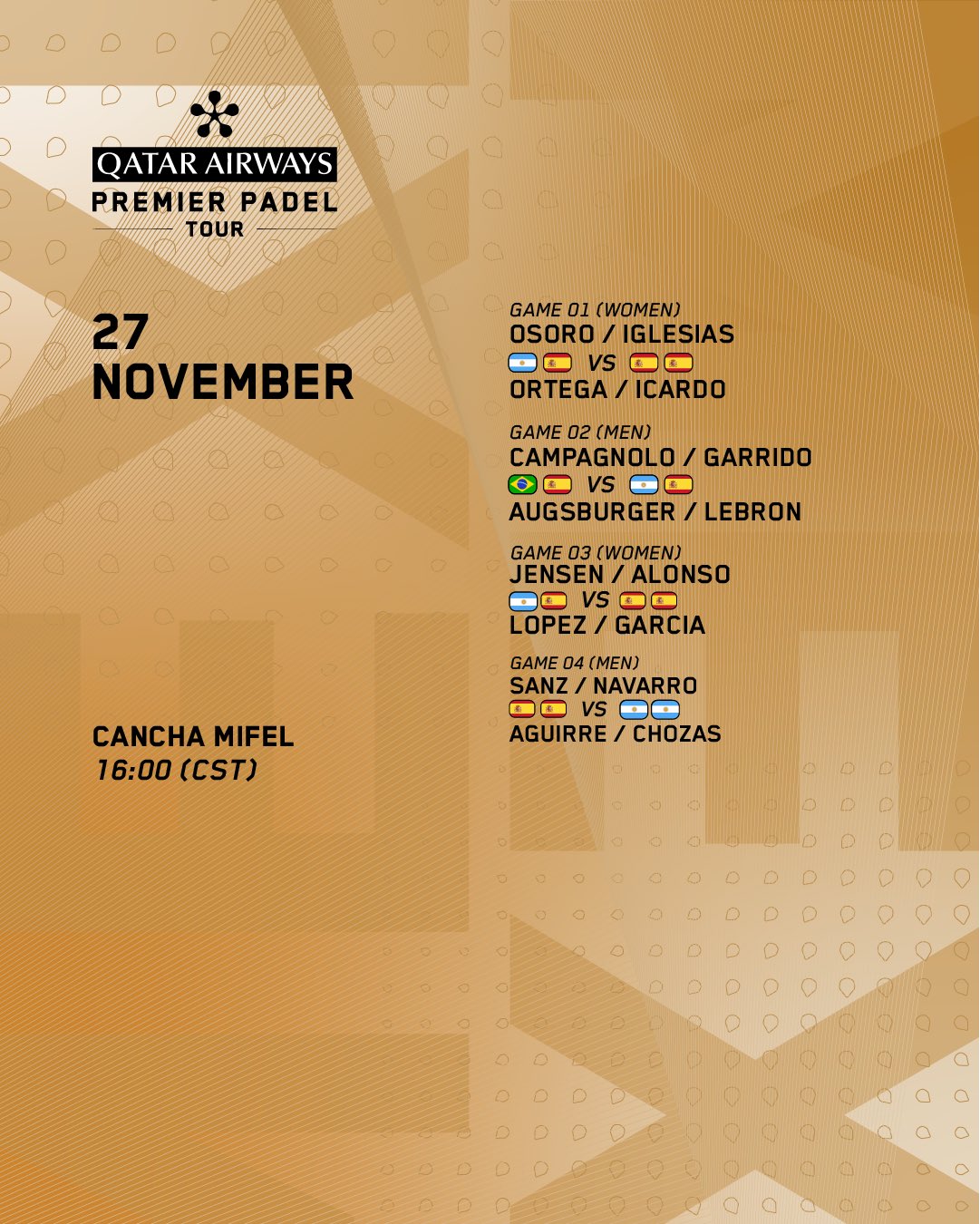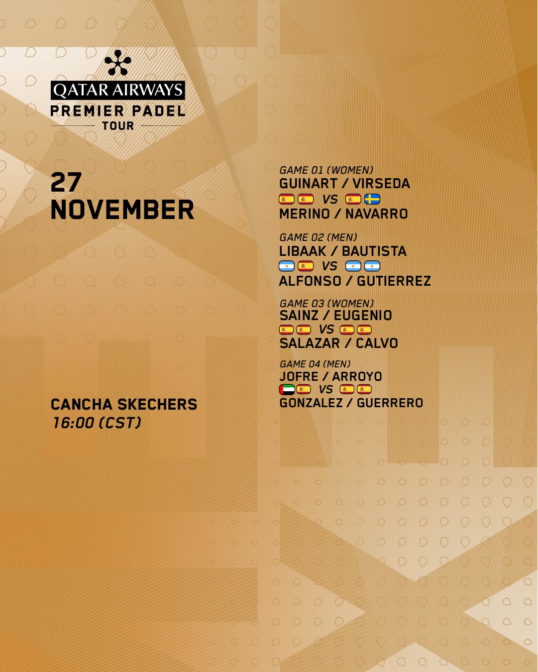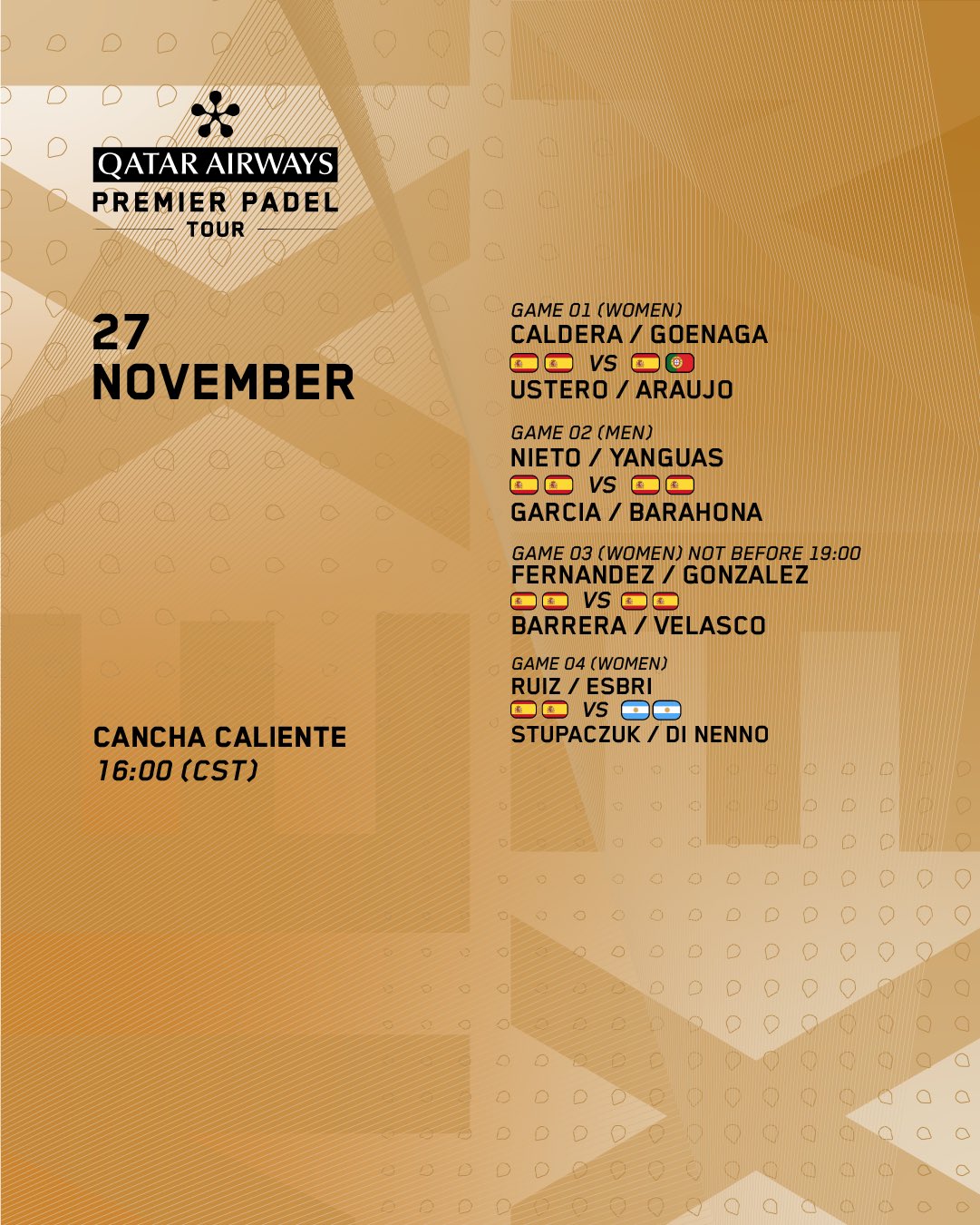 Este jueves podremos disfrutar de una jornada repleta de grandes partidos y emoción. Las tres primeras parejas del ranking femenino pisarán pista por primera vez en el último Major de la temporada. Además, también tendremos en acción a Coello y Tapia, que se saltaron los dieciseisavos debido a una lesión en la pareja rival.Horarios