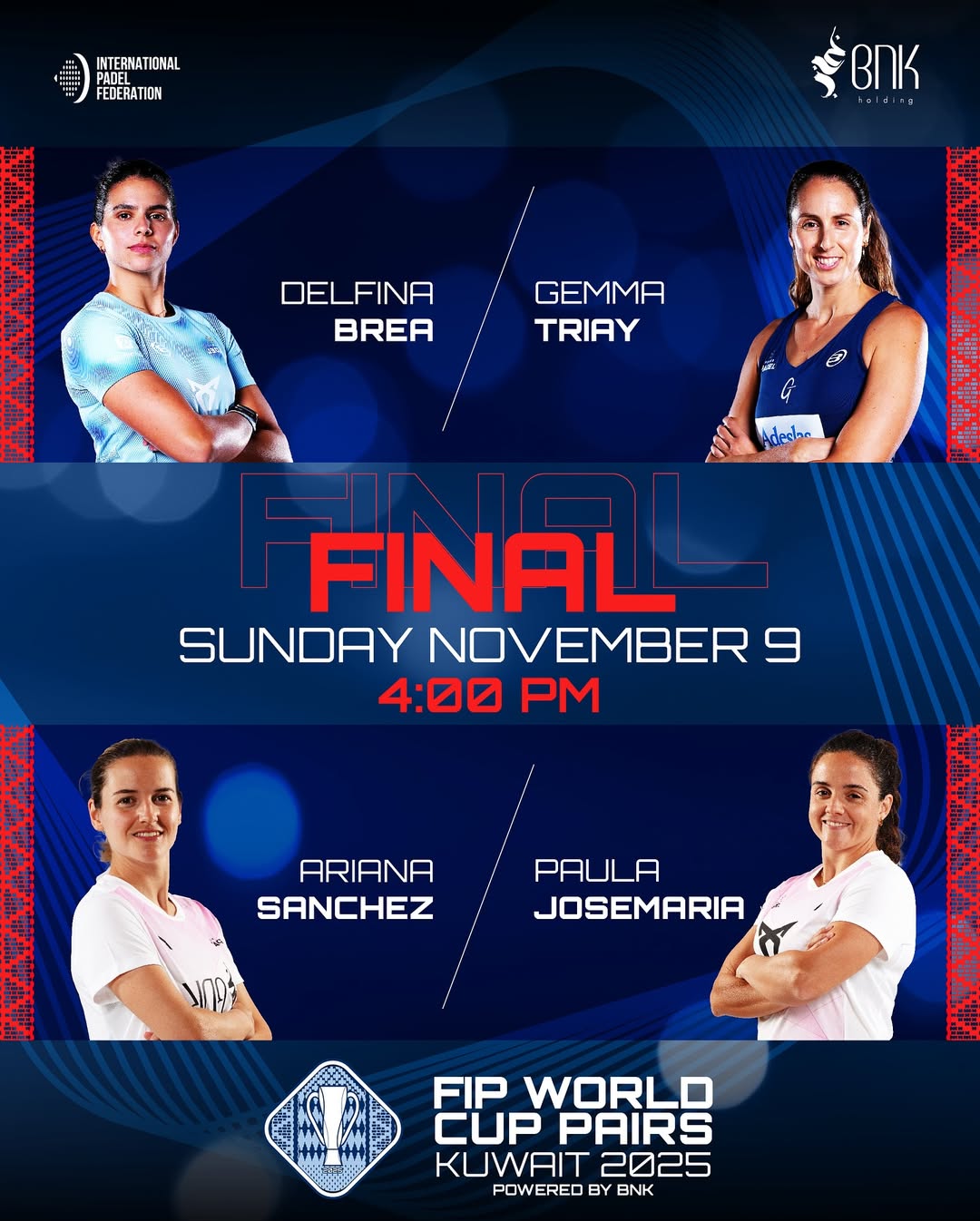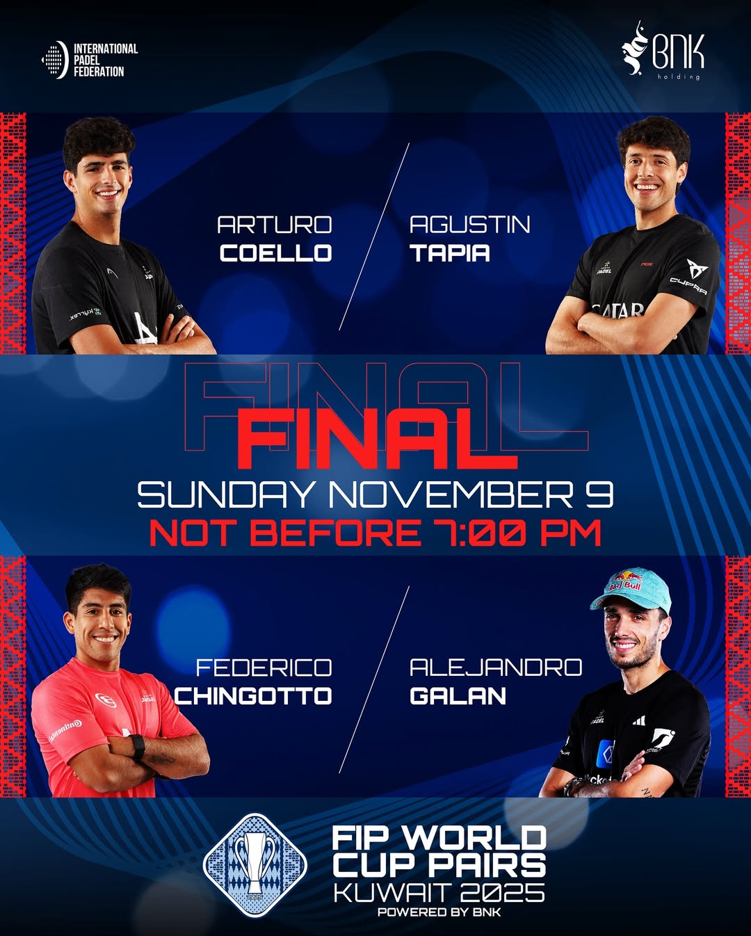 Llega a su final la FIP World Cup Pairs, que decidirá quienes se proclaman campeones del mundo de pádel por parejas. No ha habido sorpresas y se presentan como candidatos las dos mejores parejas del ranking FIP tanto masculino como femenino. No olvidemos tampoco el jugoso premio que se disputan de 2.000 puntos, que servirán para poner tierra de por medio con sus seguidores o para acortar distancias e intentar asaltar el número 1. Te contamos todo lo que debes saber a continuación para que no te pierdas nada.