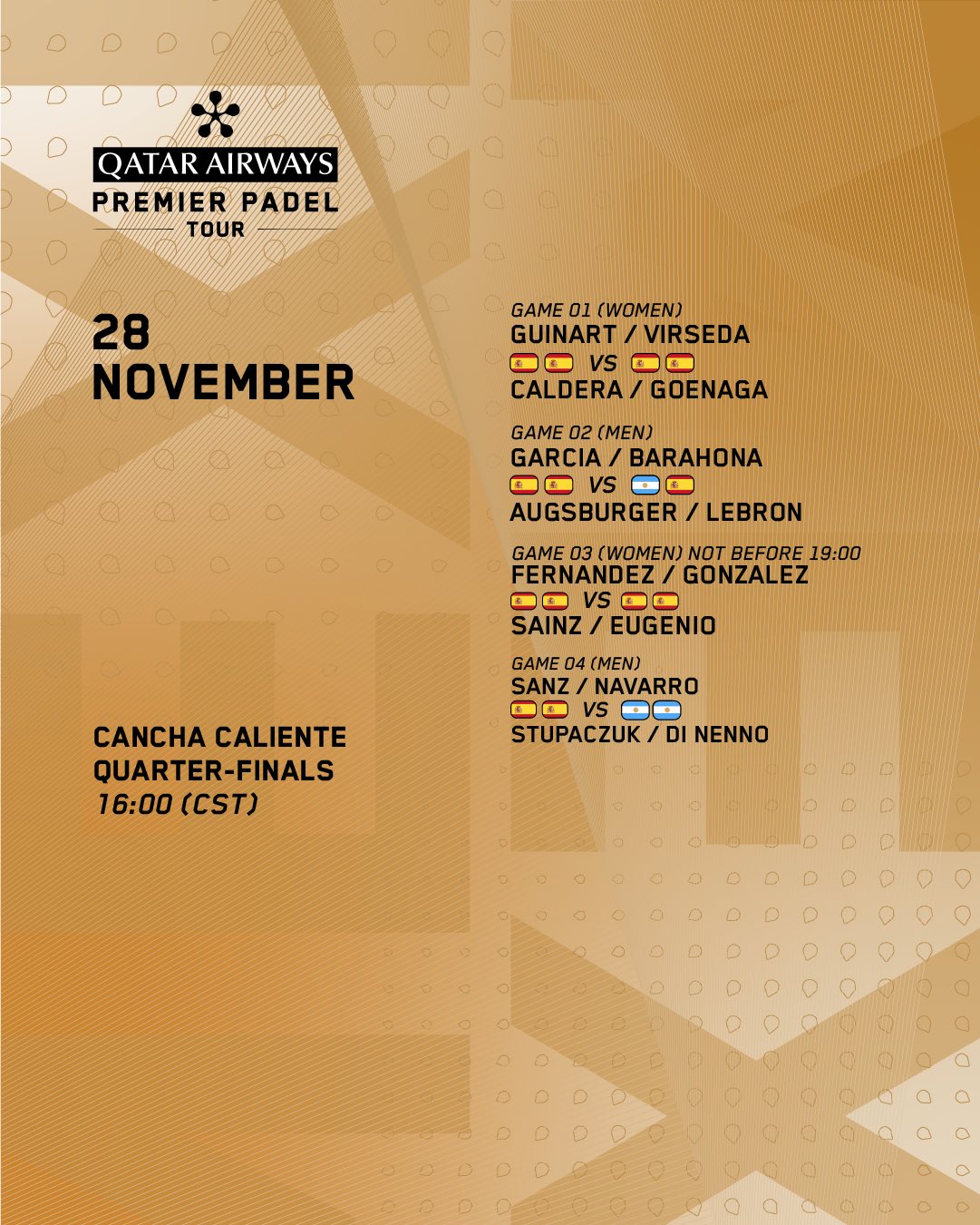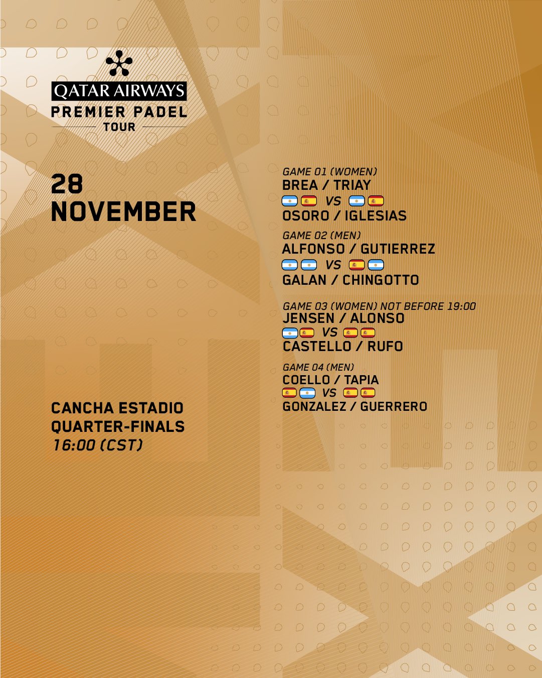 Este viernes 28 de noviembre se disputan los cuartos de final del México Major de Premier Padel. ¿Quieres saber los horarios, dónde puedes verlo y dónde apostar? Te lo contamos.