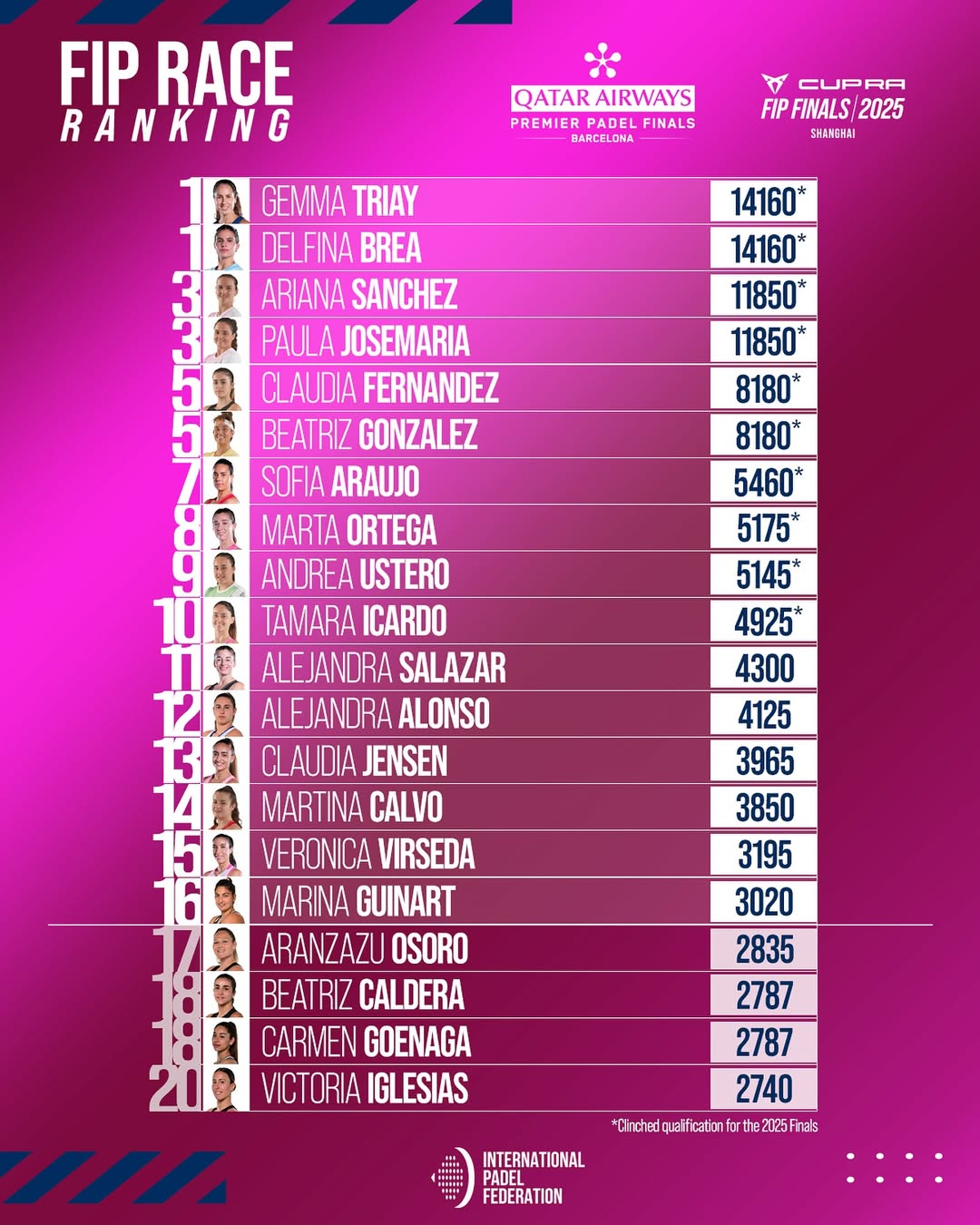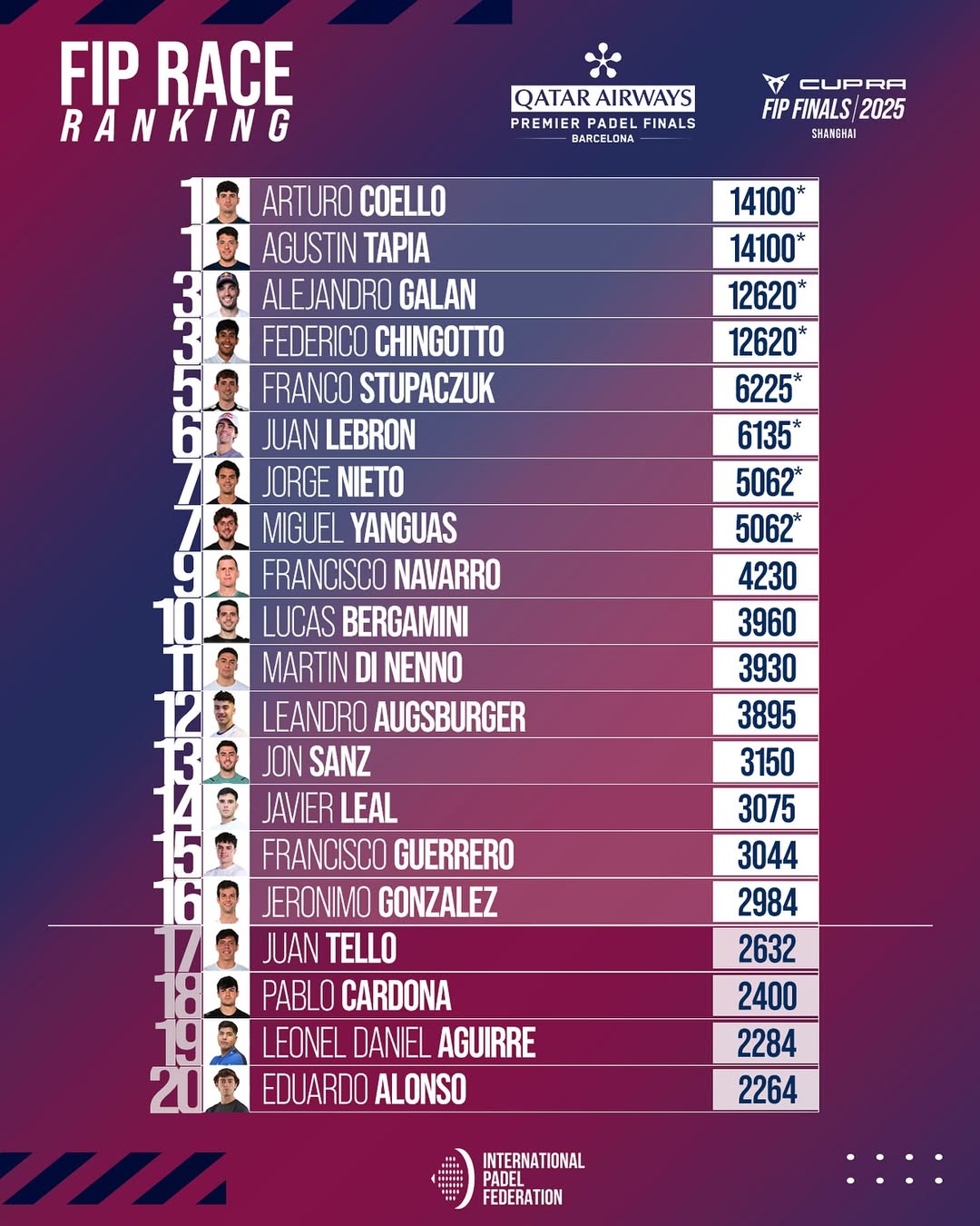 Ahora mismo, en el cuadro masculino están clasificados: Coello, Tapia, Galán, Chingotto, Lebrón, Stupaczuk, Coki Nieto y Yanguas. Asimismo, en el cuadro femenino las clasificadas hasta la fecha son: Triay, Brea, Ari Sánchez, Paula Josemaría, Bea González, Claudia Fernández, Sofía Araújo, Andrea Ustero, Marta Ortega y Tamara Icardo. Por lo que quedarían de clasificar 8 jugadores en el cuadro masculino y 6 en el cuadro femenino. En el cuadro masculino, ahora mismo es Momo González el que cierra el top 16 con 2.984 puntos, mientras que en el cuadro femenino es Marina Guinart con 3.020. Con 5.000 puntos por disputarse, Tello es que más cerca está de entrar a ese top16, con 2.632 puntos, seguido de ‘Tolito’ Aguirre con 2.284 y Edu Alonso con 2.264, con Cardona fuera de la ecuación por la lesión que le mantendrá fuera del 20×10 hasta 2026.