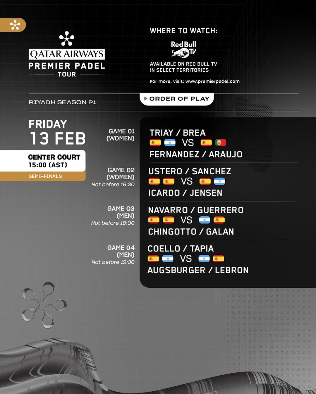 De esta forma llegamos a las semifinales de este Premier Padel Riyadh. A continuación, te ofrecemos toda la información que necesitas para no perderte nada.