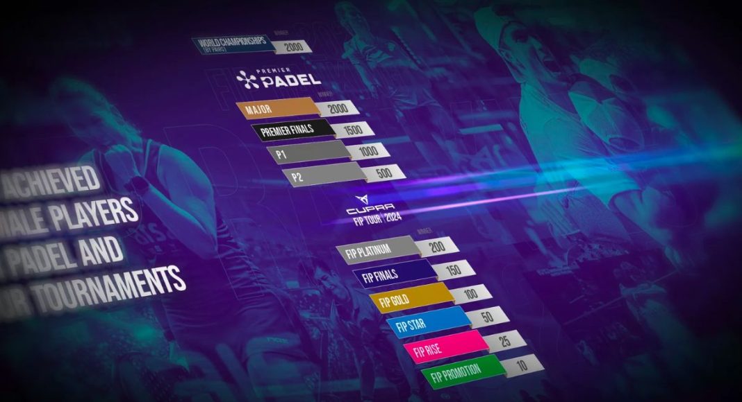 Para crear el ranking, la FIP, en colaboración con Premier Padel, la PPA y la IPPA, han decidido que se utilizarán los 22 mejores resultados obtenidos por los jugadores en los torneos Premier Padel y Cupra Fip Tour. Para defender los puntos conseguidos durante el 2023 la FIP procederá de la siguiente forma. “Se dividirá el total de puntos del ranking 2023 de cada jugador y jugadora entre 50 semanas, restándose semanalmente la misma cantidad de puntos a cada jugador y jugadora desde el 15 de enero de 2024 hasta la finalización de la temporada deportiva, 22 de diciembre de 2024?. https://www.instagram.com/p/C2AqmXko44m/?hl=es&img_index=2 Las pruebas que repartirán puntos válidos para el ranking 2024 serán el Mundial por parejas, los torneos del circuito Premier Padel y los del CUPRA FIP Tour. En Premier Padel habrá 4 tipos de torneos que otorgarán diferentes puntuaciones. La categoría Major dará 2000 puntos a los ganadores, el torneo de fin de año, las Premier Finals, darán 1500, los P1 1000 y los P2 repartirán 500 puntos. En cuanto a los CUPRA FIP Tour, los Platinum darán 200 puntos a los ganadores, las FIP Finals 150, los Gold 100, los FIP Sar 50, los FIP Rise 25 y los Promotion 10.