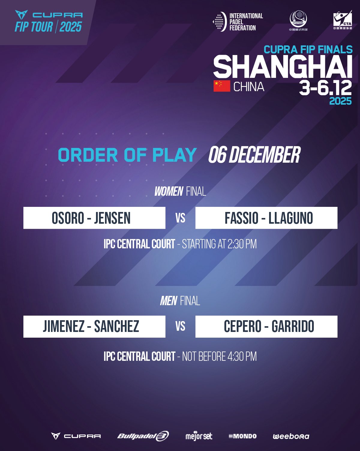 Este sábado podremos disfrutar del último torneo FIP de la temporada. Un Finals que reparte 225 puntos para los ganadores y 135 para los finalistas. Javi Garrido buscará seguir su gran dinámica del final de temporada, junto a un Cepero que está mostrando un gran nivel. Ante ellos tendrán a José Jiménez y Maxi Sánchez Blasco que derrotaron en semifinales a Jose Antonio Diestro y Javi García. En el femenino, la pareja Osoro y Claudia Jensen se medirán a Martina Fassio y Patty Llaguno.
