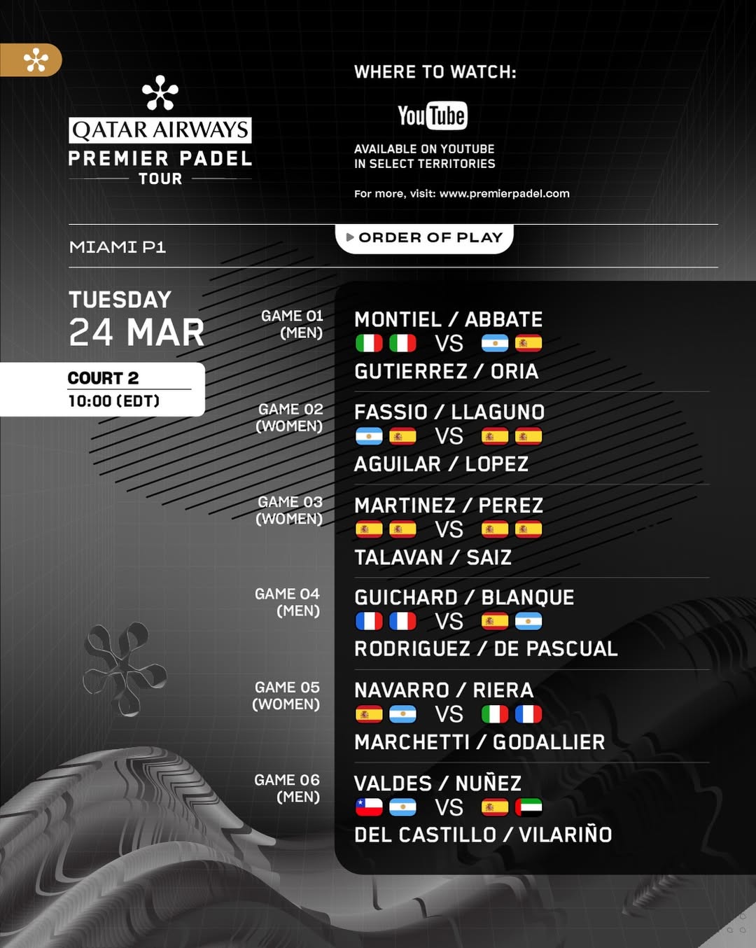 En esta jornada disfrutaremos de 18 partidos, que se dipustarán simultáneamente en Pista Central, Pista 1 y Pista 2. El comienzo será a las 15:00h en España (11:00h Argentina).