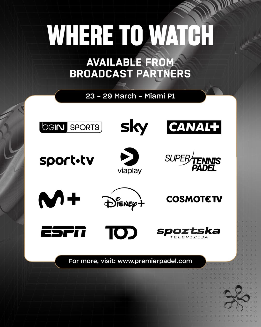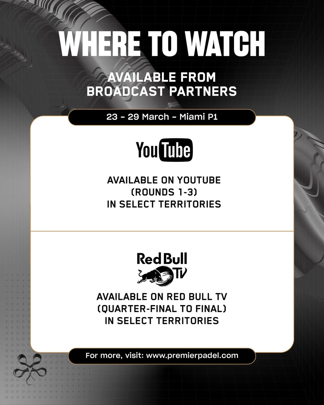En España: Podrá seguirse por el canal oficial de YouTube Premier Padel. Y a partir de cuartos, a través de la página web o la aplicación de RedBull TV. También se emitirá en Movistar Deportes.