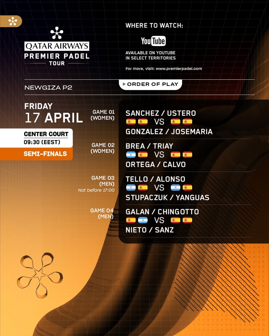 Este viernes 17 de abril se juegan las semifinales del Premier Padel Newgiza P2. Si quieres saber todos los horarios, donde puedes ver los partidos y donde apostar no te pierdas la información a continuación.