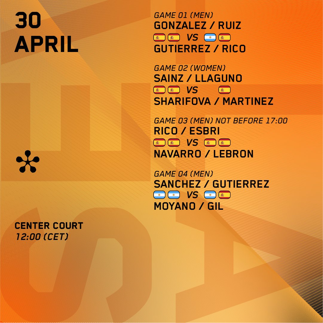 Hoy debutan parejas como Paquito y Lebrón, Sanyo y Maxi, Momo y Alex…desde las 12 de la mañana, hora española, las 7 de la mañana en Argentina empezará el cuadro principal. Así se diferenciará la jornada como se viene haciendo en los últimos torneos, un turno de mañana y un turno de tarde que no comenzará antes de las 17 horas de la tarde en España, las 12 de la mañana en Argentina. Los próximos días se seguirá este mismo desarrollo del día donde habrá partidos por la mañana y por la tarde, siempre siguiendo una horas predefinidas anteriormente.