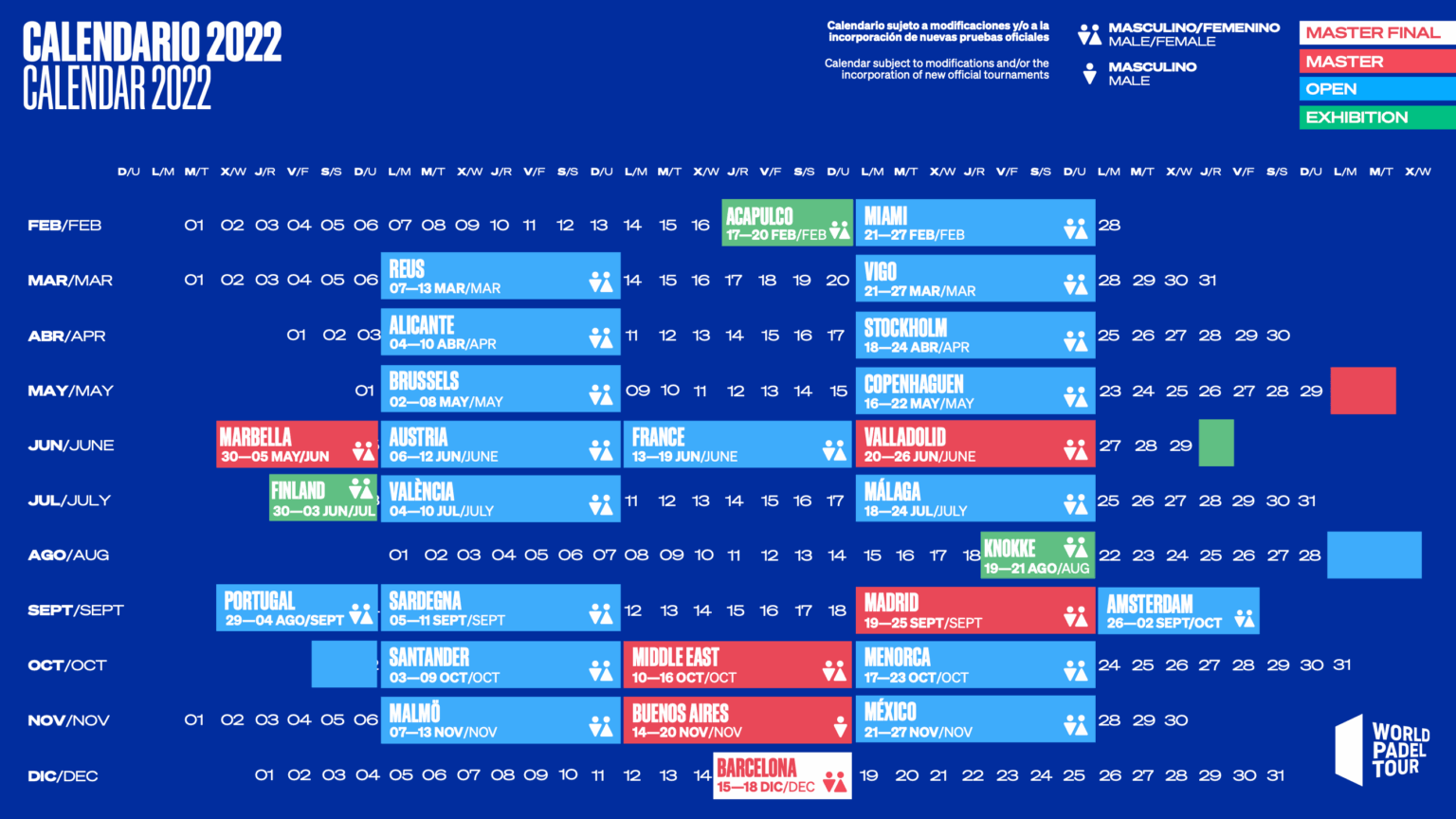 Etiquetado2022BARCELONABuenos AirescalendarioCircuitoMadridMálagaMARBELLAMiaminuevo calendarioparadaspruebasvalladolidWorld Padel Tour